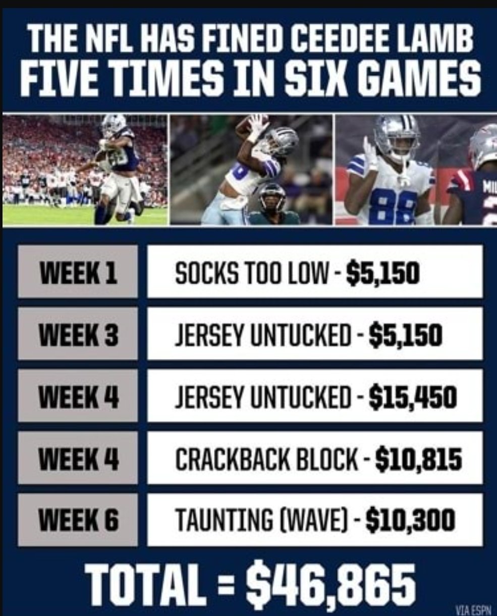 Cowboys WR CeeDee Lamb said he was confused by the NFLs decision to fine him more for having an untucked jersey than they did Aaron Rodgers for violating the NFL and NFLPAs. Cee Dee is a multiple offender for being untucked or out of uniform. Cowboys WR CeeDee Lamb has been fined five times in the first six games this season per sources.